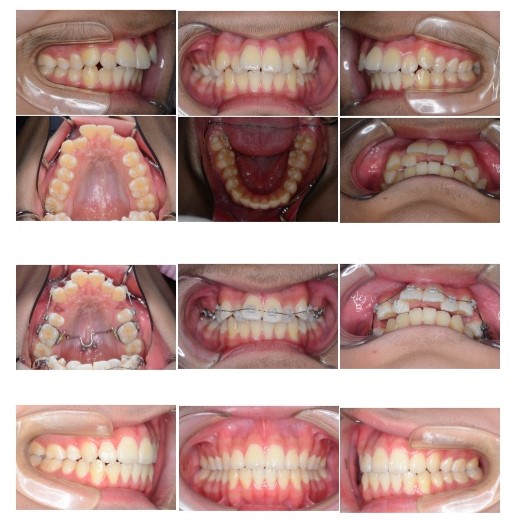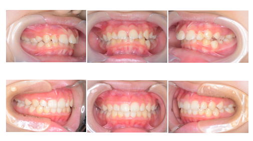 ヘッドギアーで上の奥歯を後ろに下げたあと、経過観察を行い、マルチブラケット装置で歯を並べました。